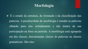 A morfologia é a parte da gramática que estuda cada uma das diversas frases, independentemente, visando sua classe gramatical, quando faz uma análise mórfica e sintática, já citados acim, ela recebe o nome morfossintaxe. Porém ela também estuda a formação e estrutura das palavras.